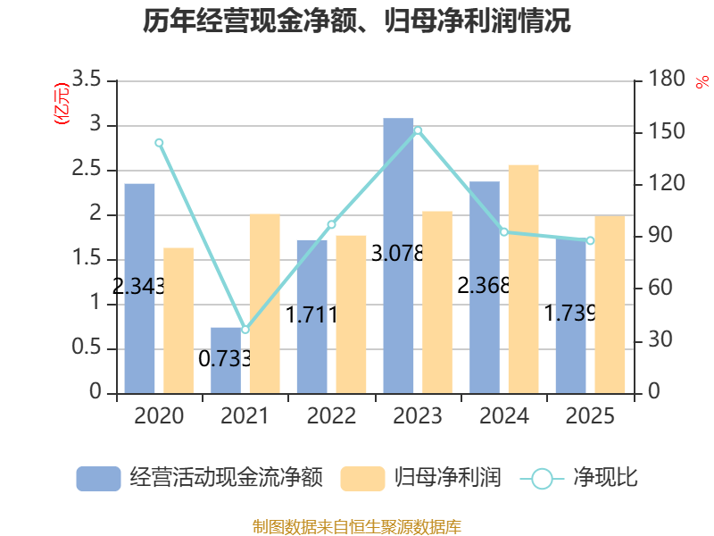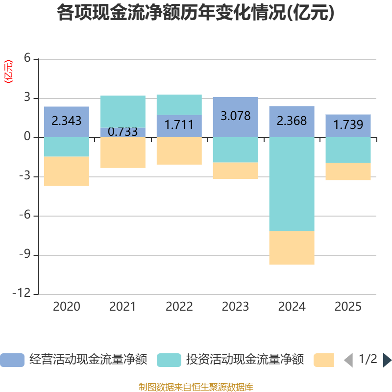截至2025年,公司经营活动现金流净额为1.74亿元,同比下降26.56%;筹资活动现金流净额-1.31亿元,同比增加1.25亿元;投资活动现金流净额-1.98亿元,上年同期为-7.19亿元。