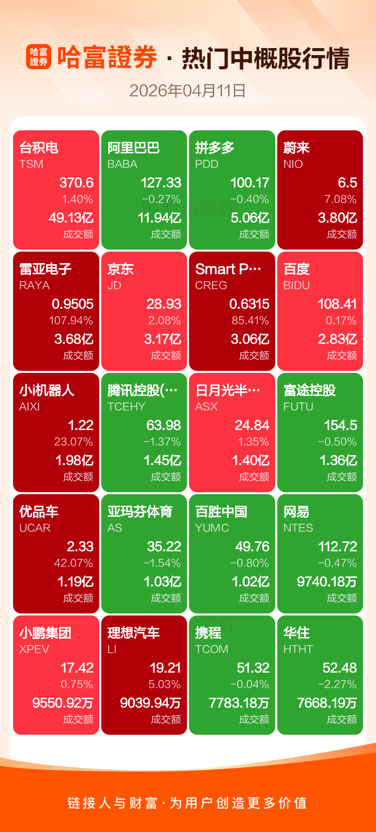 台积电涨1.40%,阿里巴巴跌0.27%,拼多多跌0.40%,蔚来涨7.08%,雷亚电子涨107.94%,京东涨2.08%,Smart Powerr Corp涨85.41%,百度涨0.17%,小i机器人涨23.07%,腾讯控股(ADR)跌1.37%。