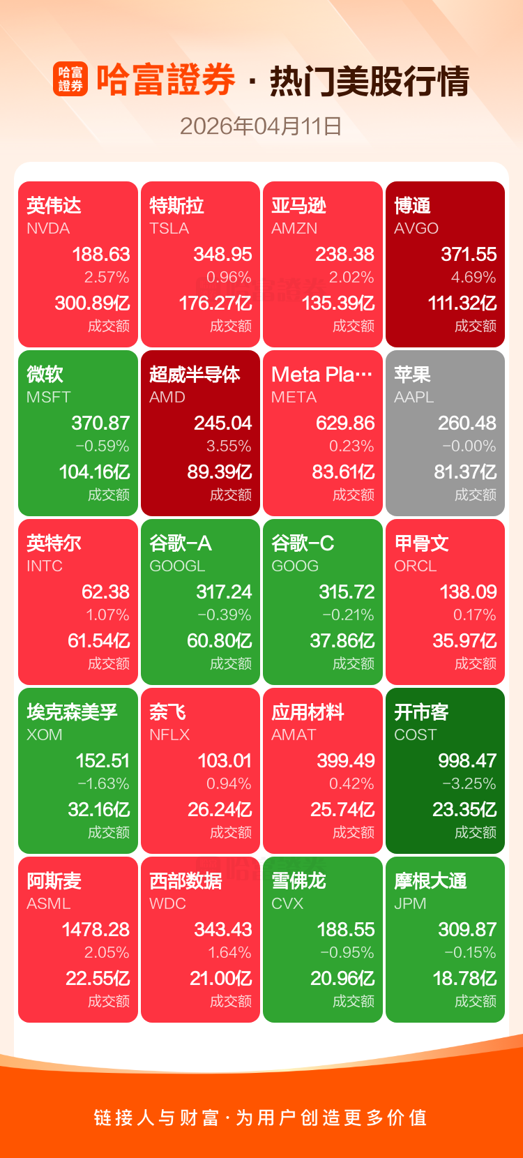 英伟达涨2.57%,特斯拉涨0.96%,亚马逊涨2.02%,博通涨4.69%,微软跌0.59%,超威半导体涨3.55%,Meta Platforms Inc-A涨0.23%,苹果跌0.00%,英特尔涨1.07%,谷歌-A跌0.39%。