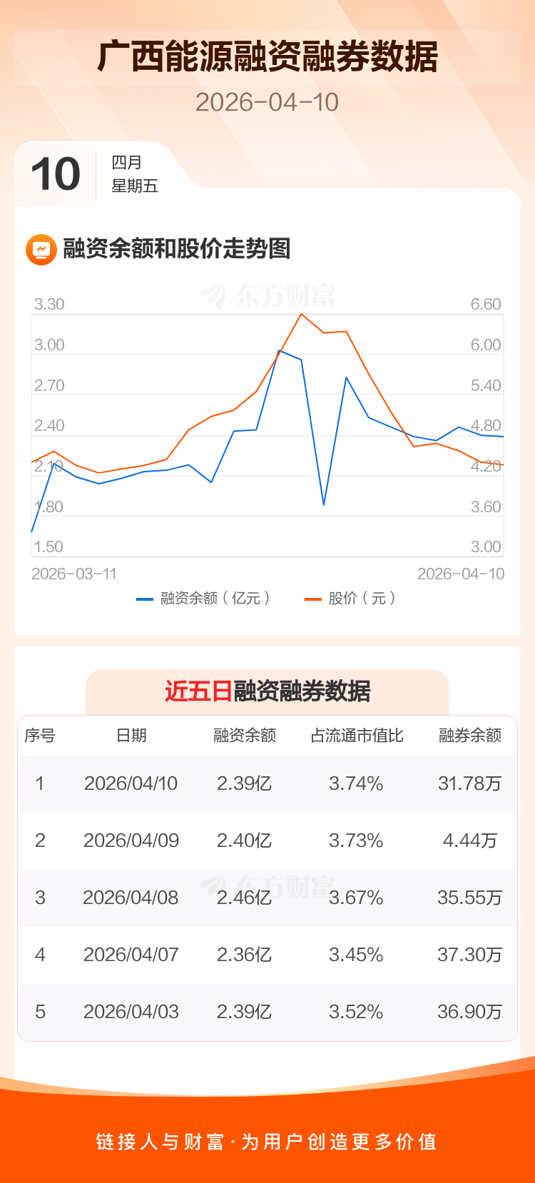 交易所最新数据显示,广西能源于2026年4月10日获融资买入3497.83万元,融资偿还3632.58万元,当日融资净偿还134.76万元。目前,该股融资余额2.39亿,占流通市值比例为3.74%。