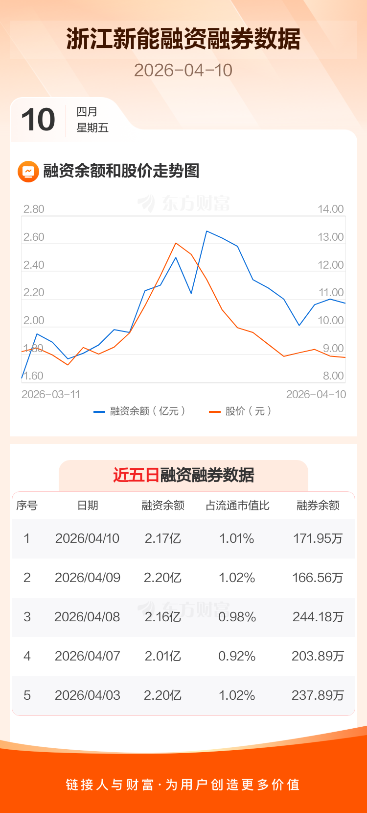 交易所最新数据显示,浙江新能于2026年4月10日获融资买入3289.85万元,融资偿还3617.47万元,当日融资净偿还327.62万元。目前,该股融资余额2.17亿,占流通市值比例为1.01%。