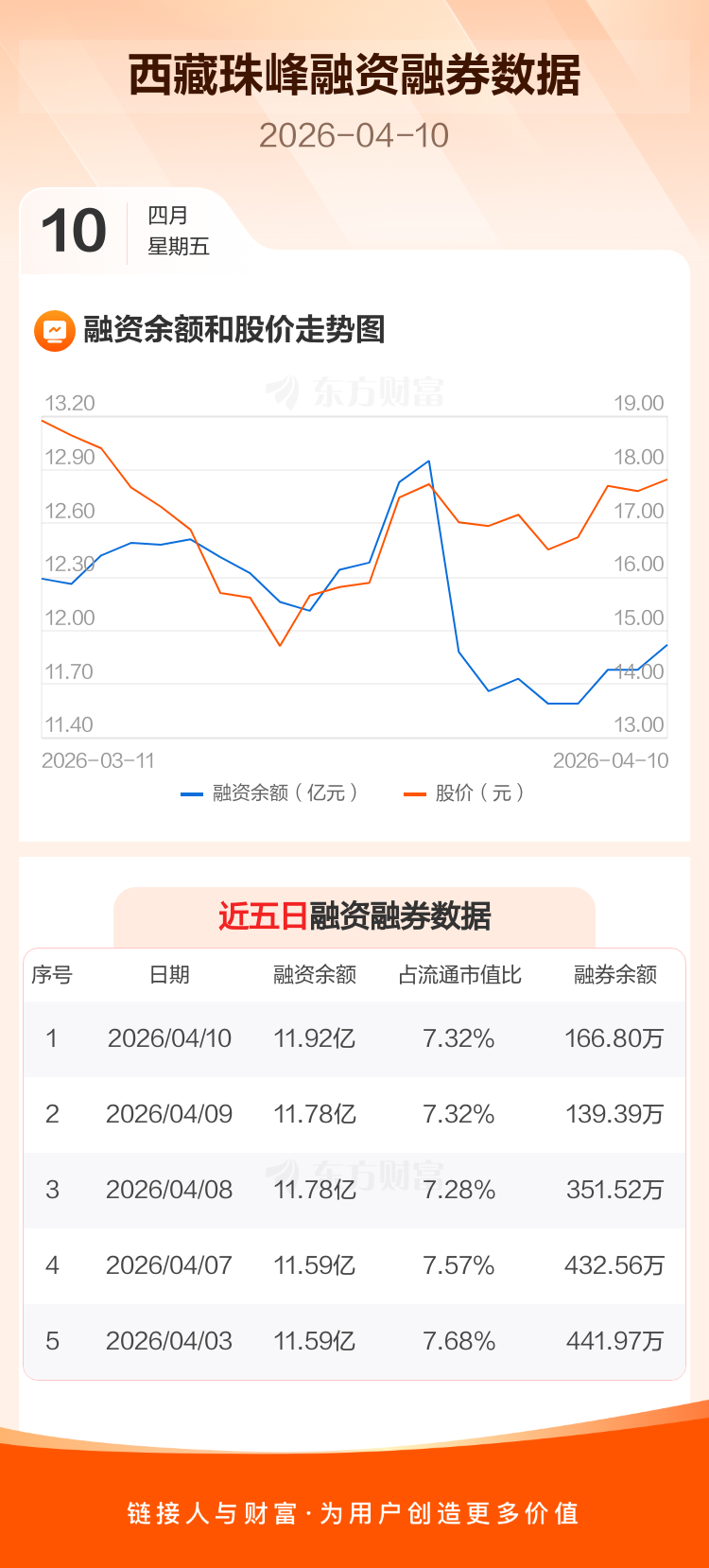 交易所最新数据显示,西藏珠峰于2026年4月10日获融资买入9038.98万元,融资偿还7629.43万元,当日融资净买入1409.55万元。目前,该股融资余额11.92亿,占流通市值比例为7.32%。