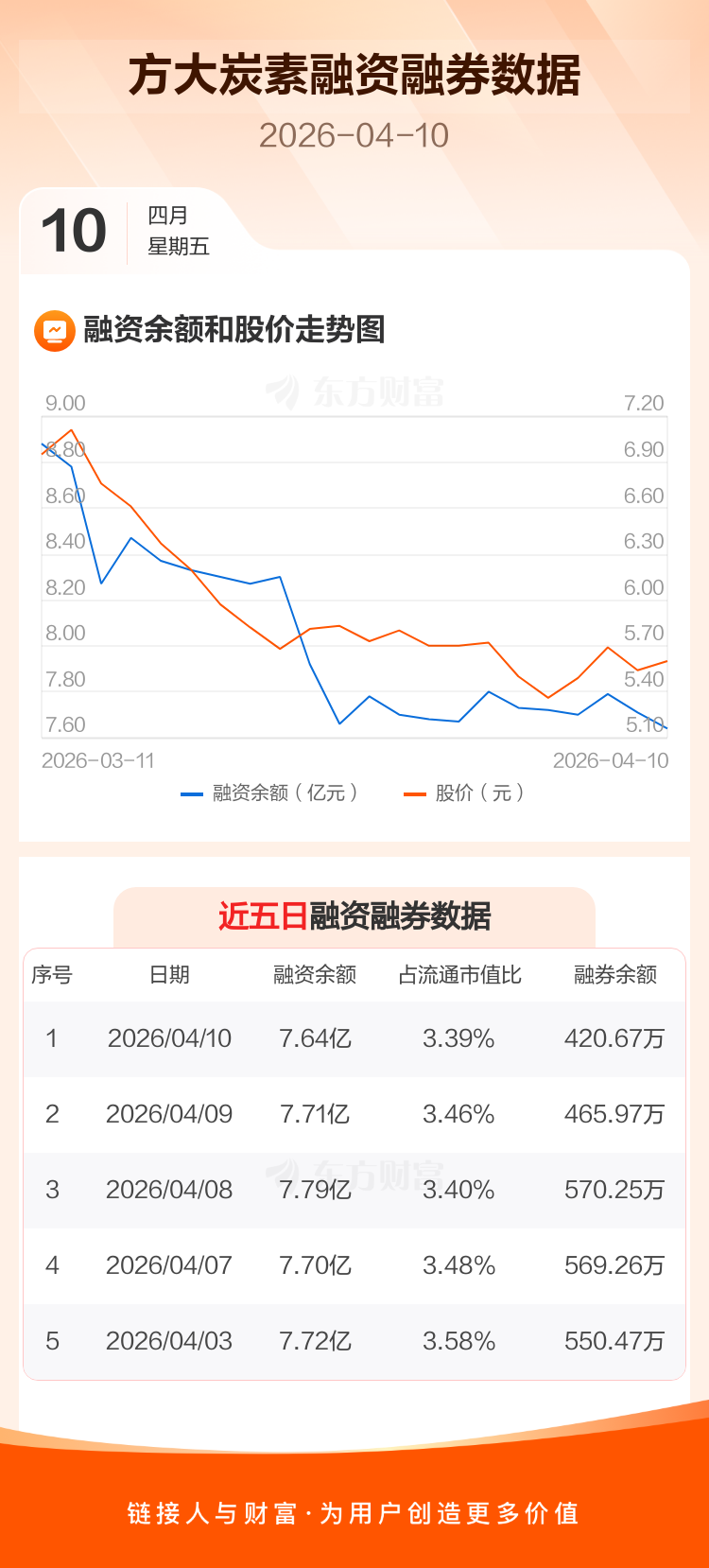 交易所最新数据显示,方大炭素于2026年4月10日获融资买入1297.53万元,融资偿还2067.64万元,当日融资净偿还770.12万元。目前,该股融资余额7.64亿,占流通市值比例为3.39%。