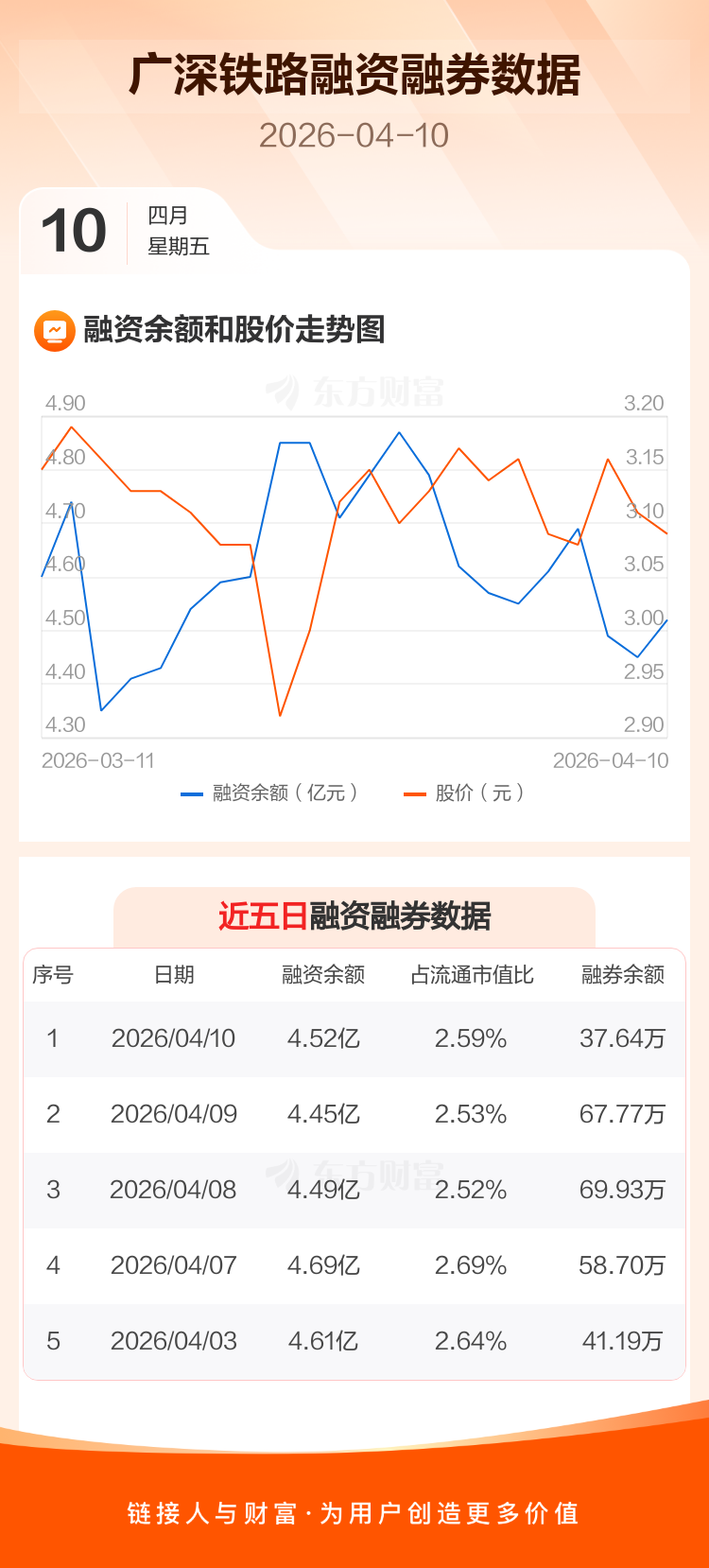 交易所最新数据显示,广深铁路于2026年4月10日获融资买入1356.84万元,融资偿还697.74万元,当日融资净买入659.1万元。目前,该股融资余额4.52亿,占流通市值比例为2.59%。
