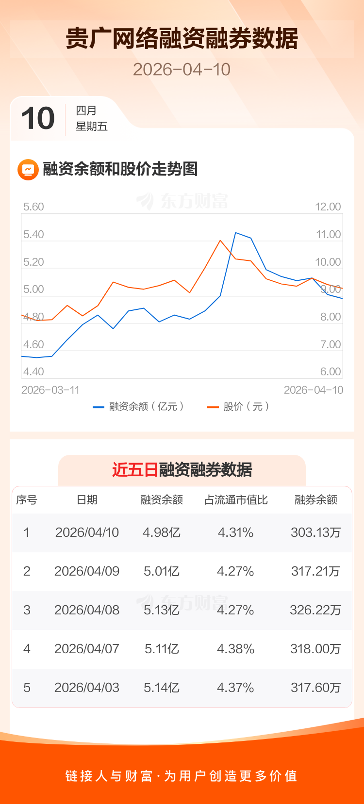 交易所最新数据显示,贵广网络于2026年4月10日获融资买入2554.98万元,融资偿还2916.45万元,当日融资净偿还361.47万元。目前,该股融资余额4.98亿,占流通市值比例为4.31%。
