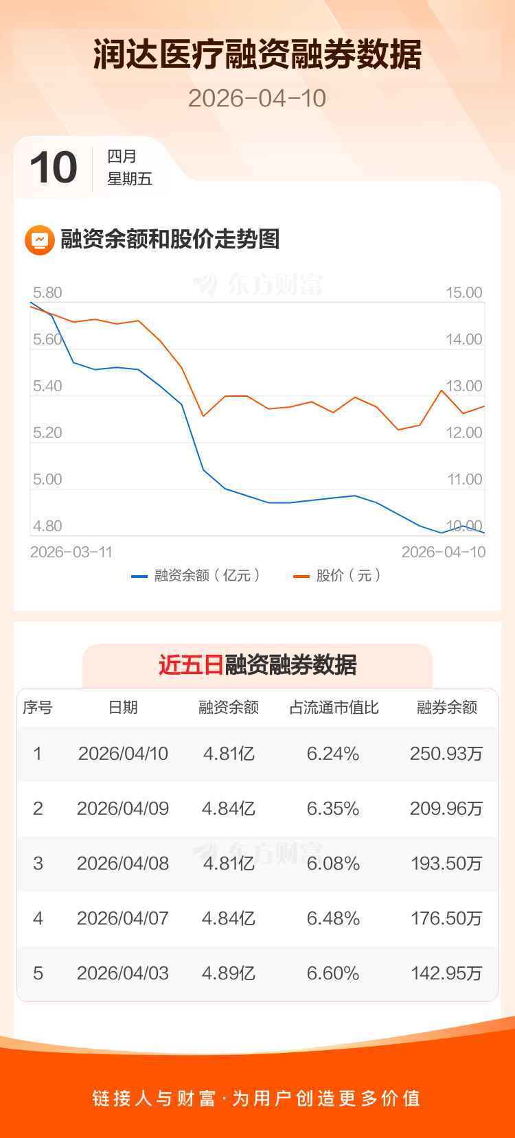 交易所最新数据显示,润达医疗于2026年4月10日获融资买入803.01万元,融资偿还1021.78万元,当日融资净偿还218.77万元。目前,该股融资余额4.81亿,占流通市值比例为6.24%。