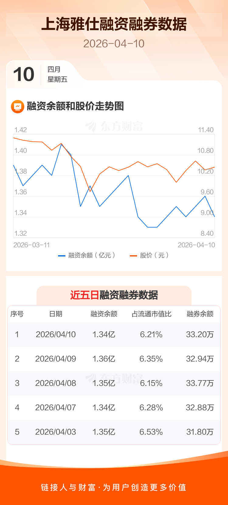 交易所最新数据显示,上海雅仕于2026年4月10日获融资买入160.40万元,融资偿还344.80万元,当日融资净偿还184.41万元。目前,该股融资余额1.34亿,占流通市值比例为6.21%。