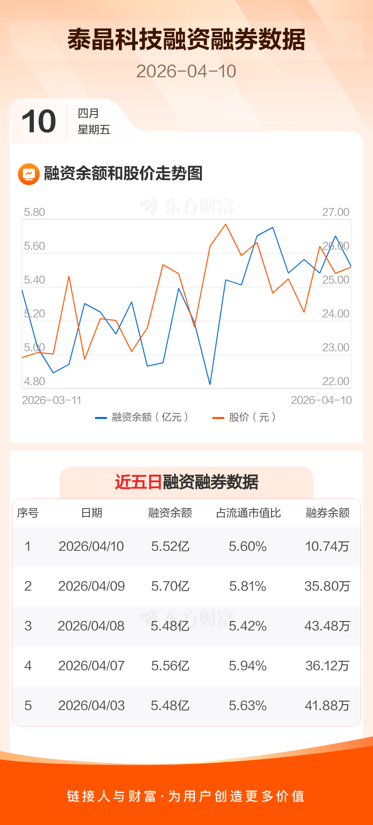 交易所最新数据显示,泰晶科技于2026年4月10日获融资买入1.11亿元,融资偿还1.28亿元,当日融资净偿还1721.29万元。目前,该股融资余额5.52亿,占流通市值比例为5.60%。