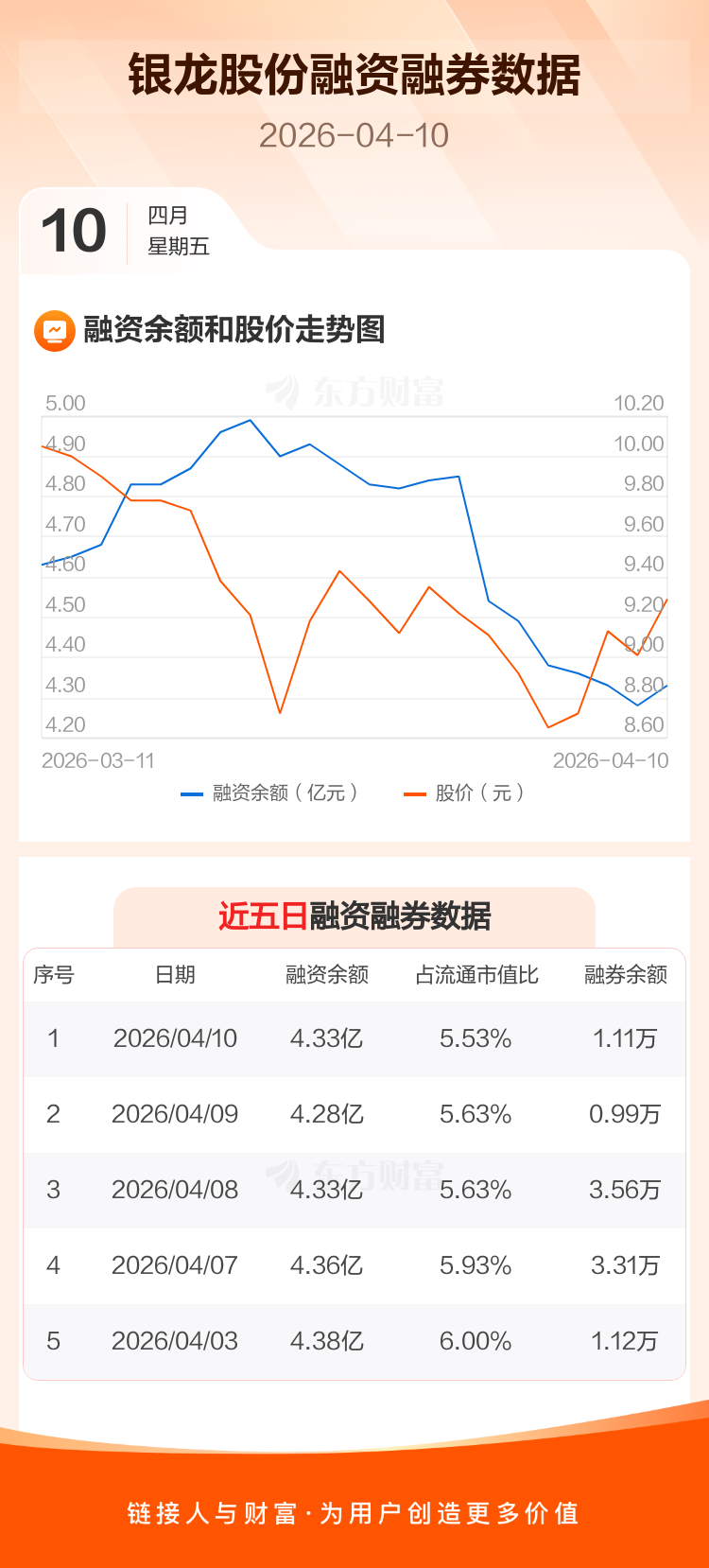 交易所最新数据显示,银龙股份于2026年4月10日获融资买入1322.14万元,融资偿还809.63万元,当日融资净买入512.52万元。目前,该股融资余额4.33亿,占流通市值比例为5.53%。