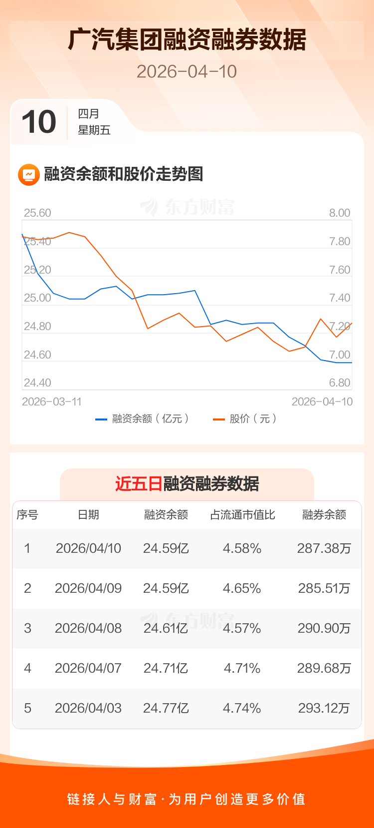 交易所最新数据显示,广汽集团于2026年4月10日获融资买入1091.92万元,融资偿还1089.00万元,当日融资净买入2.92万元。目前,该股融资余额24.59亿,占流通市值比例为4.58%。