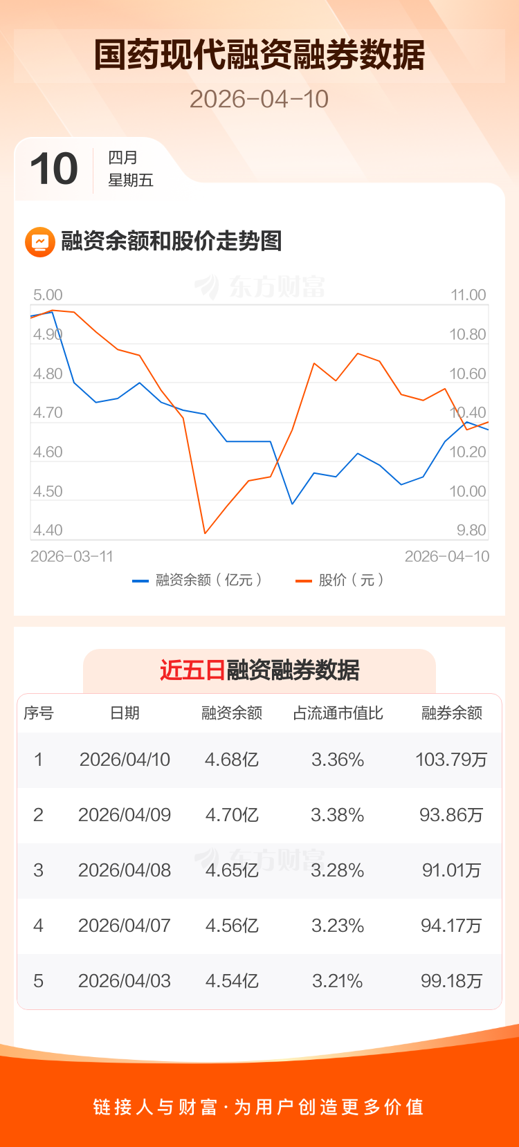 交易所最新数据显示,国药现代于2026年4月10日获融资买入1080.01万元,融资偿还1206.47万元,当日融资净偿还126.46万元。目前,该股融资余额4.68亿,占流通市值比例为3.36%。