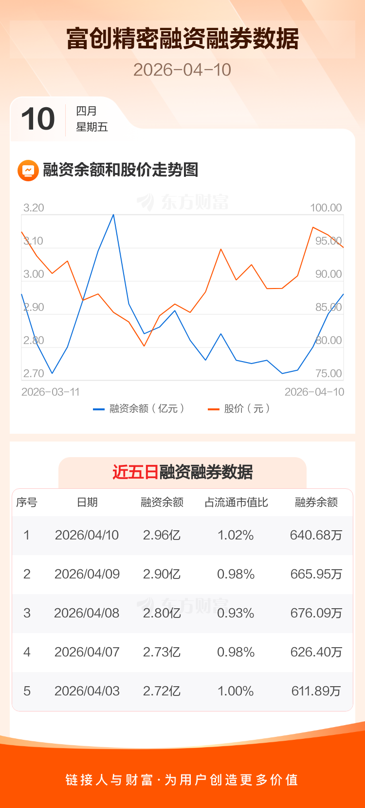 交易所最新数据显示,富创精密于2026年4月10日获融资买入5613.56万元,融资偿还5060.96万元,当日融资净买入552.6万元。目前,该股融资余额2.96亿,占流通市值比例为1.02%。
