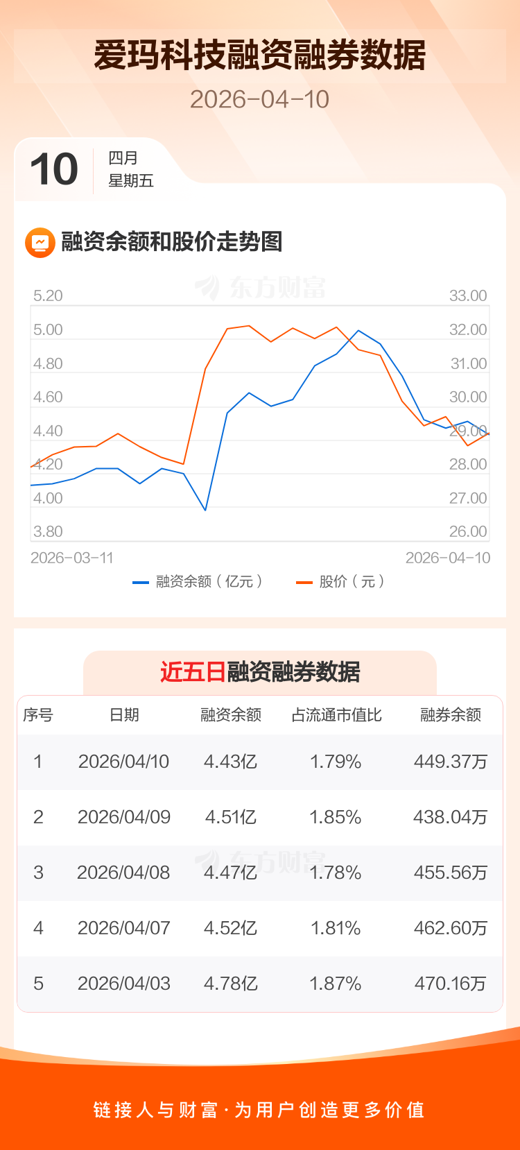 交易所最新数据显示,爱玛科技于2026年4月10日获融资买入3698.41万元,融资偿还4548.90万元,当日融资净偿还850.5万元。目前,该股融资余额4.43亿,占流通市值比例为1.79%。