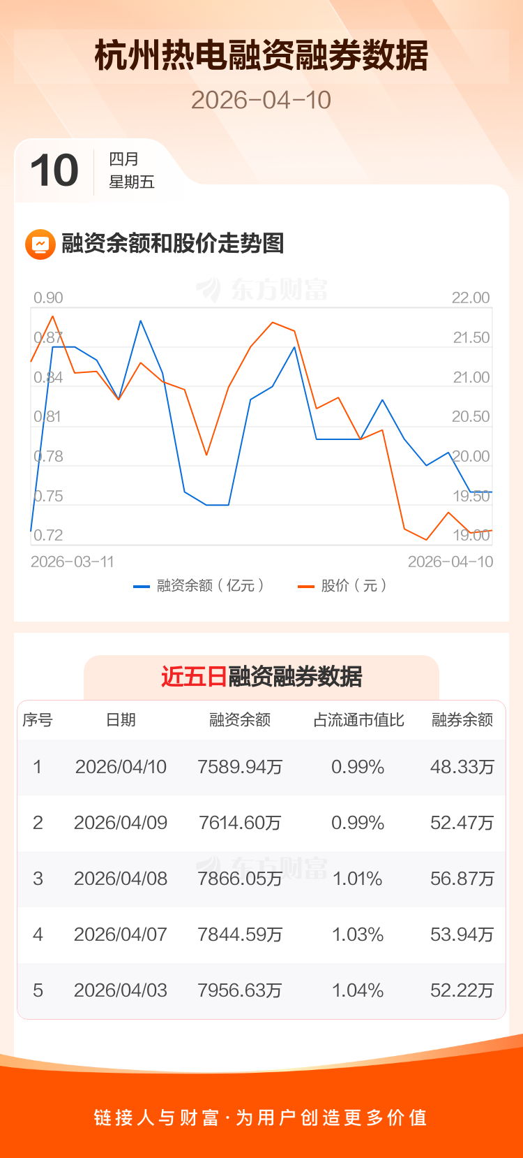 交易所最新数据显示,杭州热电于2026年4月10日获融资买入428.96万元,融资偿还453.62万元,当日融资净偿还24.66万元。目前,该股融资余额7589.94万,占流通市值比例为0.99%。