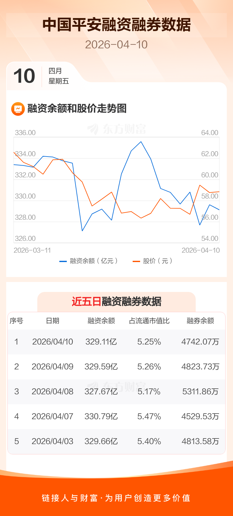 交易所最新数据显示,中国平安于2026年4月10日获融资买入3.83亿元,融资偿还4.31亿元,当日融资净偿还4798.87万元。目前,该股融资余额329.11亿,占流通市值比例为5.25%。