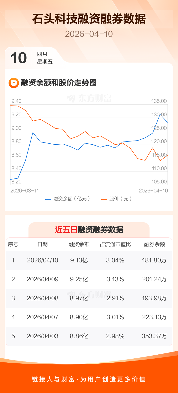 交易所最新数据显示,石头科技于2026年4月10日获融资买入3016.35万元,融资偿还4208.59万元,当日融资净偿还1192.24万元。目前,该股融资余额9.13亿,占流通市值比例为3.04%。