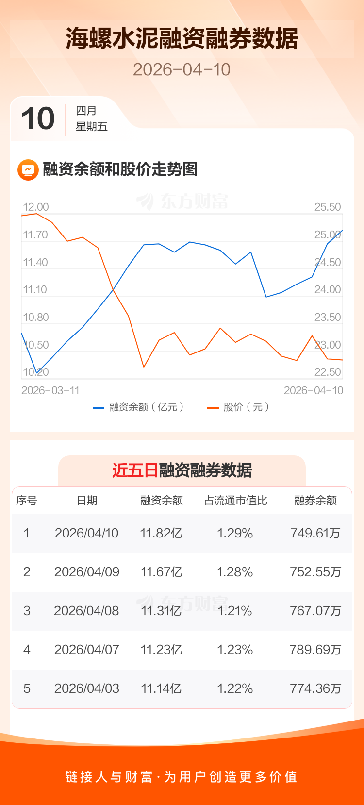 交易所最新数据显示,海螺水泥于2026年4月10日获融资买入4286.73万元,融资偿还2775.85万元,当日融资净买入1510.88万元。目前,该股融资余额11.82亿,占流通市值比例为1.29%。