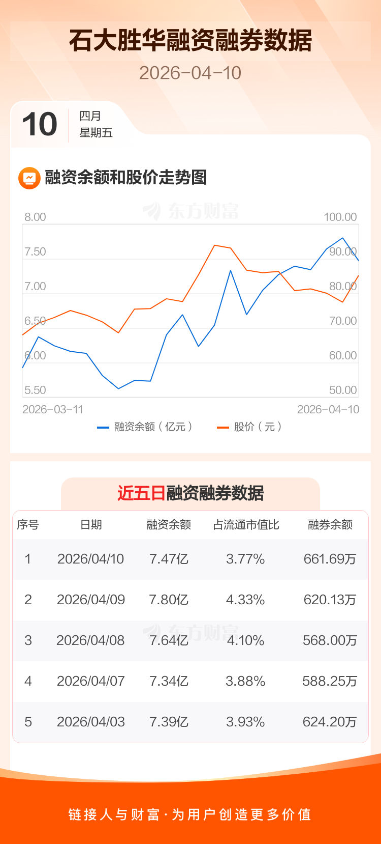 交易所最新数据显示,石大胜华于2026年4月10日获融资买入1.67亿元,融资偿还2.00亿元,当日融资净偿还3294.58万元。目前,该股融资余额7.47亿,占流通市值比例为3.77%。