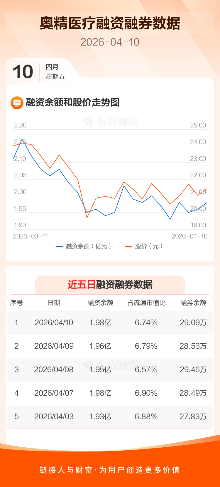 交易所最新数据显示,奥精医疗于2026年4月10日获融资买入1090.77万元,融资偿还856.66万元,当日融资净买入234.1万元。目前,该股融资余额1.98亿,占流通市值比例为6.74%。