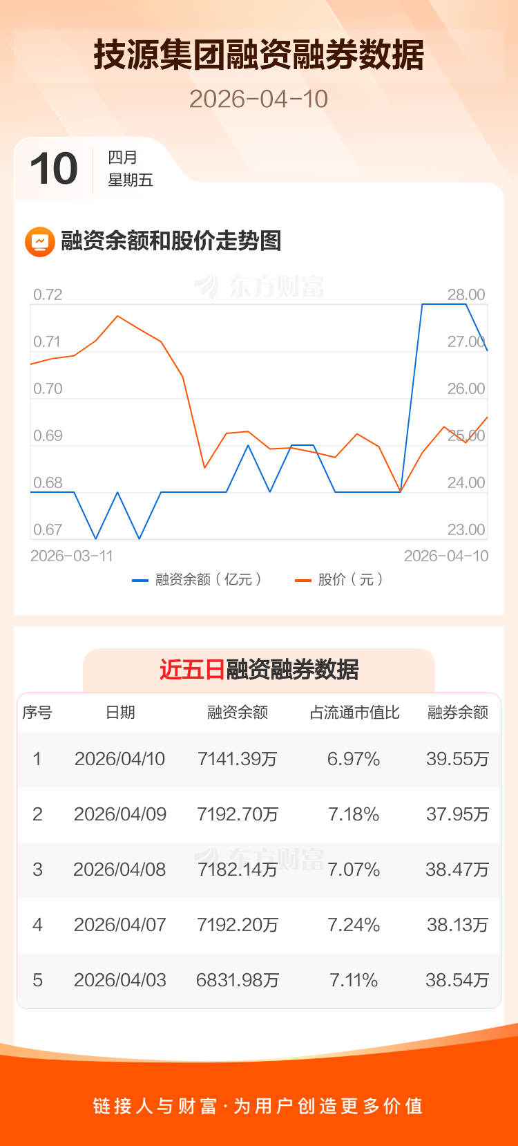 交易所最新数据显示,技源集团于2026年4月10日获融资买入272.27万元,融资偿还323.57万元,当日融资净偿还51.31万元。目前,该股融资余额7141.39万,占流通市值比例为6.97%。