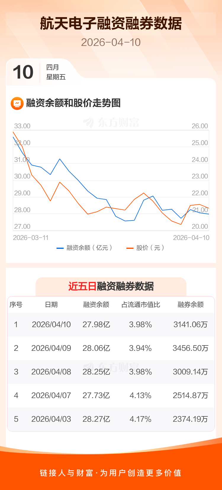 交易所最新数据显示,航天电子于2026年4月10日获融资买入1.71亿元,融资偿还1.80亿元,当日融资净偿还858.87万元。目前,该股融资余额27.98亿,占流通市值比例为3.98%。