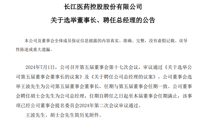 2024年7月,长药控股召开股东大会,王波、翁浩、赵守军、高应会当选新任董事,秦子胤当选新任监事。前述人士均在十堰国资系统有任职经历。公司董事会选举王波为新任董事长、聘任胡士会为新任总经理。
