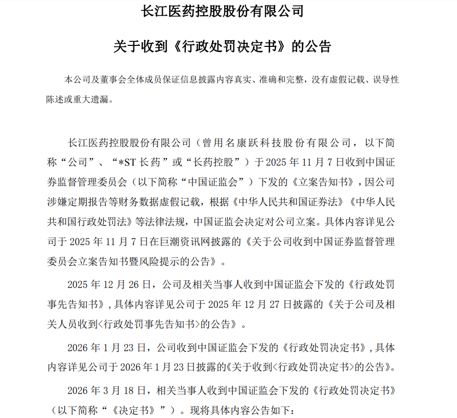 公司今年3月18日披露,收到中国证监会下发的《行政处罚决定书》。根据认定的事实,公司2021年、2022年、2023年年度报告存在虚假记载,公司触及重大违法强制退市情形,公司股票将被终止上市。相关当事人被处罚金共计3100万元。罗明作为*ST长药2021年至2023年年度报告存在虚假记载直接负责的主管人员,其违法行为严重扰乱证券市场秩序,被采取终身证券市场禁入措施。