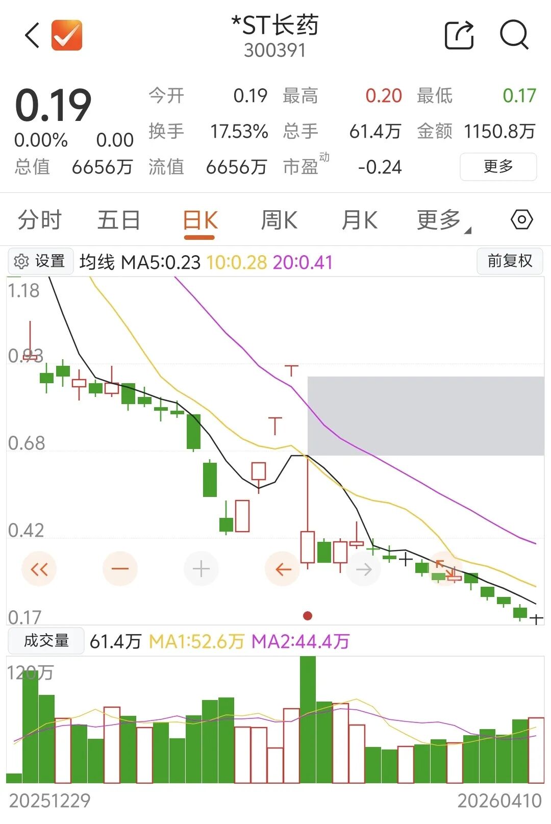 4月10日,长药退度过了退市整理期的最后一个交易日。当天收盘,公司股价报0.19元,总市值约6600万元。公司股票终止上市后,将转入全国股转公司代为管理的退市板块进行转让。