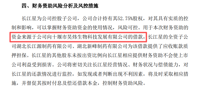 一个月后的2023年11月,长药控股发布公告称,公司将为长江星提供3亿元额度的财务资助,此次财务资助的资金来源于十堰昊炜。公开资料显示,十堰昊炜成立于2023年3月,为湖北十堰郧阳区财政局控制的企业。
