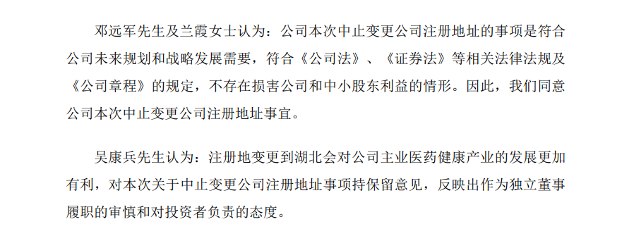 当时,公司三名独立董事对迁址的不同意见,也反映出背后的博弈:公司独立董事邓远军、兰霞认为,本次中止变更公司注册地址的事项是符合公司未来规划和战略发展需要,符合法规及《公司章程》的规定,不存在损害公司和中小股东利益的情形。独立董事吴康兵认为,注册地变更到湖北会对公司主业医药健康产业的发展更加有利,对本次关于中止变更公司注册地址事项持保留意见。