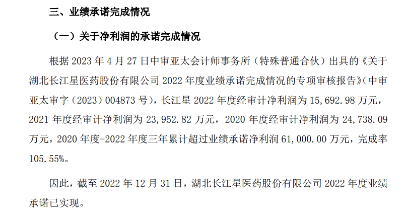 长江星原实际控制人罗明等对长江星2020年至2022年净利润等指标进行了业绩承诺。公司在2023年6月披露,长江星2020年度至2022年度三年累计超过业绩承诺净利润6.1亿元,完成率105.55%。因此,截至2022年12月31日,湖北长江星医药股份有限公司2022年度业绩承诺已实现。