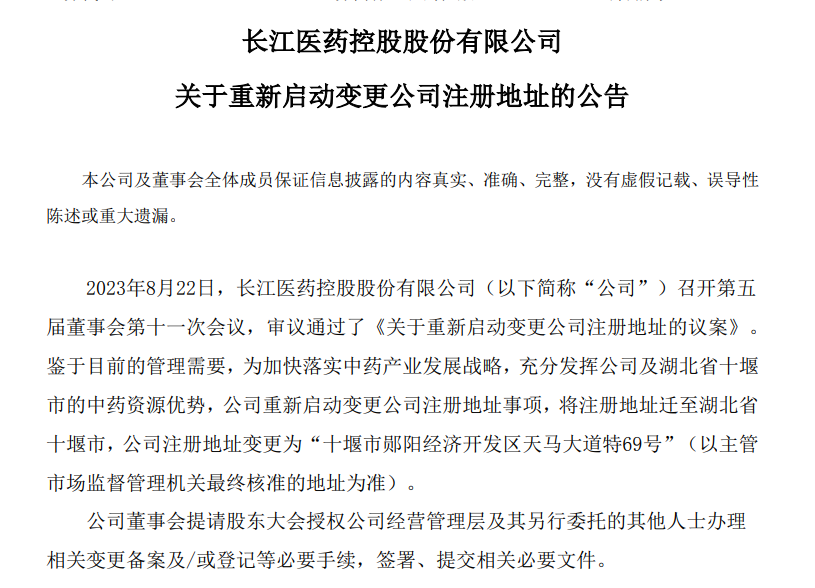 2023年8月,公司发布公告,鉴于目前的管理需要,为加快落实中药产业发展战略,充分发挥公司及湖北省十堰市的中药资源优势,公司重新启动变更公司注册地址事项。并最终在2023年10月完成注册地址变更登记手续,注册地由山东潍坊寿光正式迁至湖北十堰郧阳经济开发区。