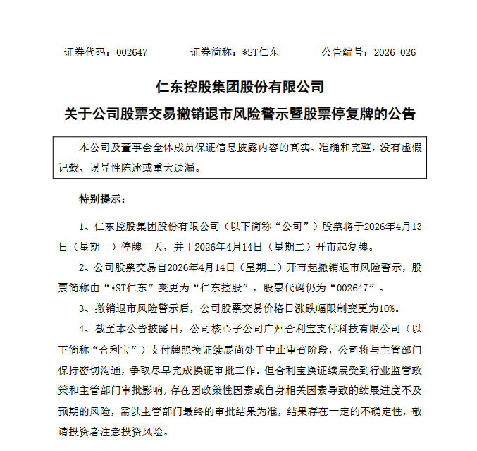 4月10日晚间,仁东控股(002647.SZ)重磅公告,公司撤销退市风险警示的申请已获深交所审核通过,成功实现“摘星脱帽”,彻底告别风险警示周期。股票简称将于4月14日起正式恢复为“仁东控股”。