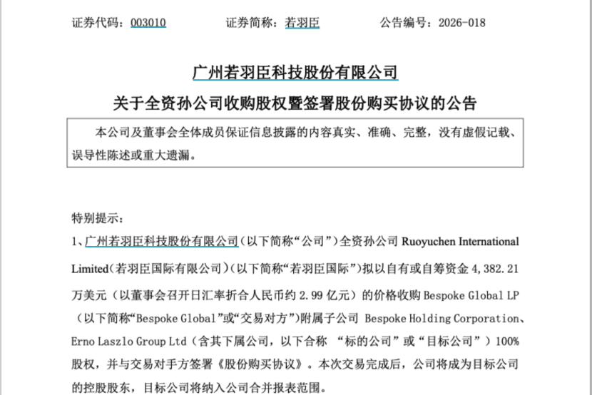 4月10日晚间,“电商代运营第一股”若羽臣公告,全资孙公司若羽臣国际拟以4382.21万美元(折合人民币约2.99亿元)的价格收购Bespoke Global附属子公司Bespoke Holding Corporation、Erno Laszlo Group Ltd(含下属公司)100%股权。