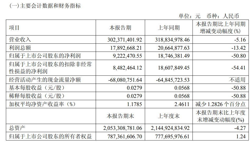 宝光股份2026年一季报显示,公司营业收入为3.02亿元,同比下降5.16%;归母净利润为922万元,同比下降50.80%;扣非归母净利润为848万元,同比下降54.41%;经营现金流净额为-6808万元。