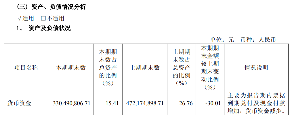 货币资金方面,公司去年末货币资金为3.3亿元,同比下降30.01%,主要为报告期内票据到期兑付及现金付款增加,货币资金减少。