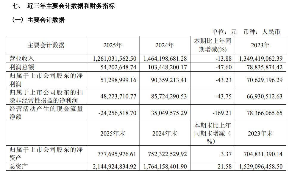 宝光股份2025年年报显示,2025年面对复杂多变的外部环境、日趋激烈的市场竞争,以及主要原材料铜、银价格大幅上涨带来的成本压力,公司迎难而上,紧紧围绕年度经营目标展开攻坚。从总体经营情况上看,报告期内公司实现合并营业收入12.61亿元,同比下降13.88%;利润总额5,420.26万元,同比下降47.60%;归属于上市公司股东的净利润5,129.90万元,同比下降43.23%。巨潮资讯数据显示,这一数据创下了公司4年来年度净利的新低。