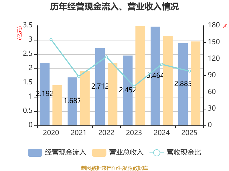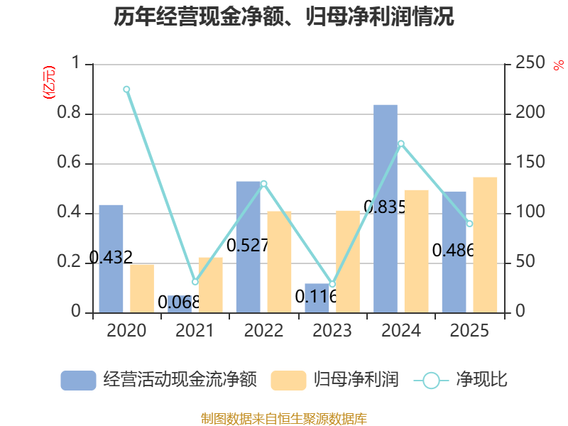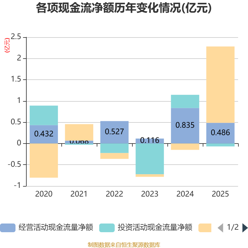 截至2025年,公司经营活动现金流净额为4858.16万元,同比下降41.8%;筹资活动现金流净额1.8亿元,同比增加1.95亿元;投资活动现金流净额-686.67万元,上年同期为3097.03万元。