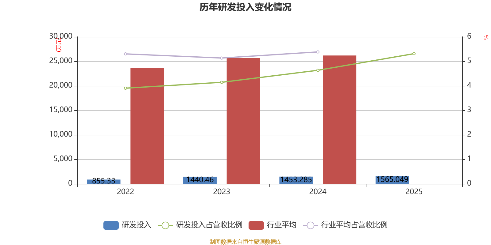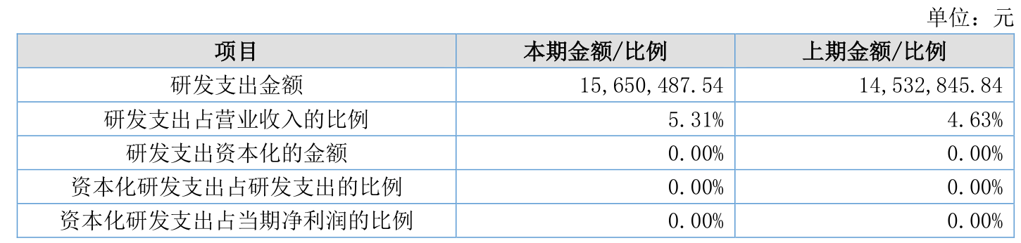 2025年全年,公司研发投入金额为1565.05万元,同比增长7.69%;研发投入占营业收入比例为5.31%,相比上年同期上升0.68个百分点。此外,公司全年研发投入资本化率为0%。