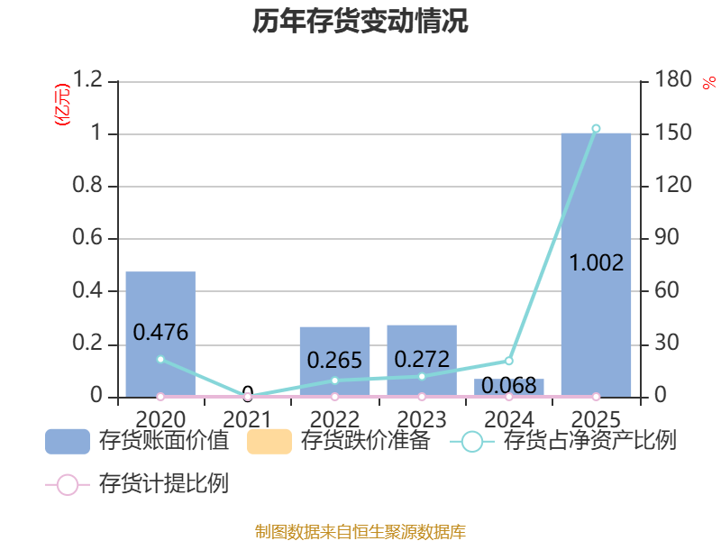 从存货变动来看,截至2025年末,公司存货账面价值为1亿元,占净资产的152.99%,较上年末增加9334.65万元。公司本期没有计提存货跌价准备。