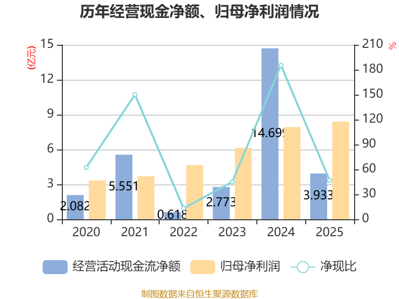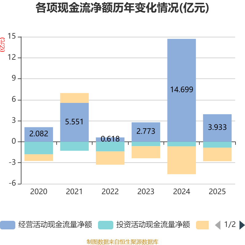 截至2025年,公司经营活动现金流净额为3.93亿元,同比下降73.24%;筹资活动现金流净额-1.94亿元,同比增加2.04亿元;投资活动现金流净额-8460.28万元,上年同期为-6571.55万元。