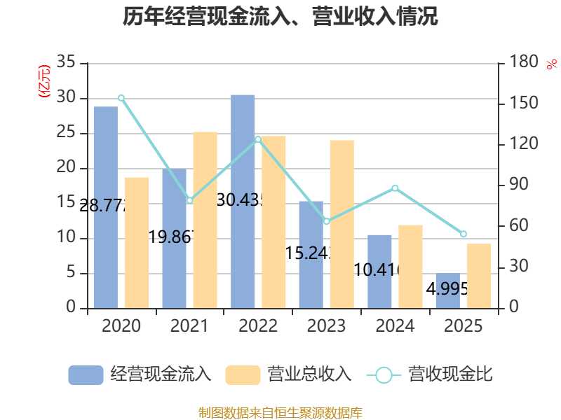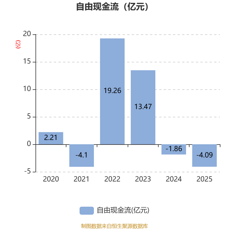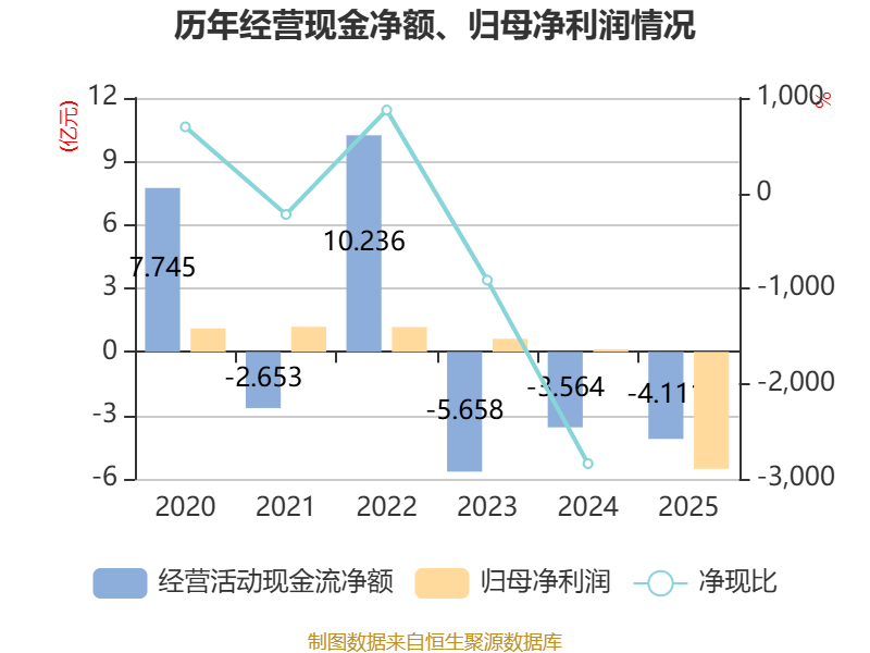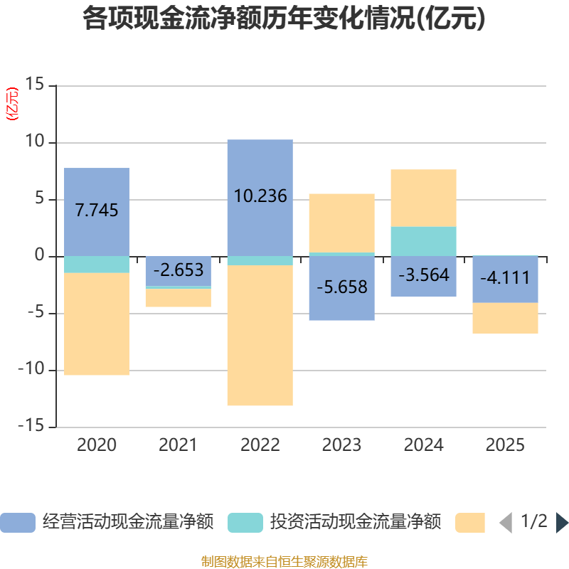 截至2025年,公司经营活动现金流净额为-4.11亿元,同比减少5469.4万元;筹资活动现金流净额-2.7亿元,同比减少7.72亿元;投资活动现金流净额615.54万元,上年同期为2.6亿元。