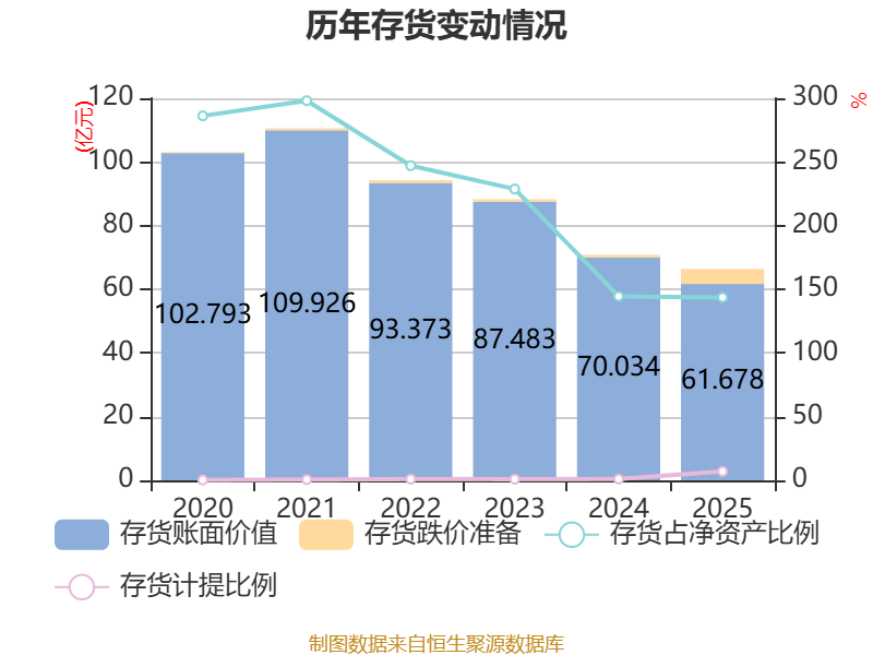 从存货变动来看,截至2025年末,公司存货账面价值为61.68亿元,占净资产的143.62%,较上年末减少8.36亿元。其中,存货跌价准备为4.67亿元,计提比例为7.03%。