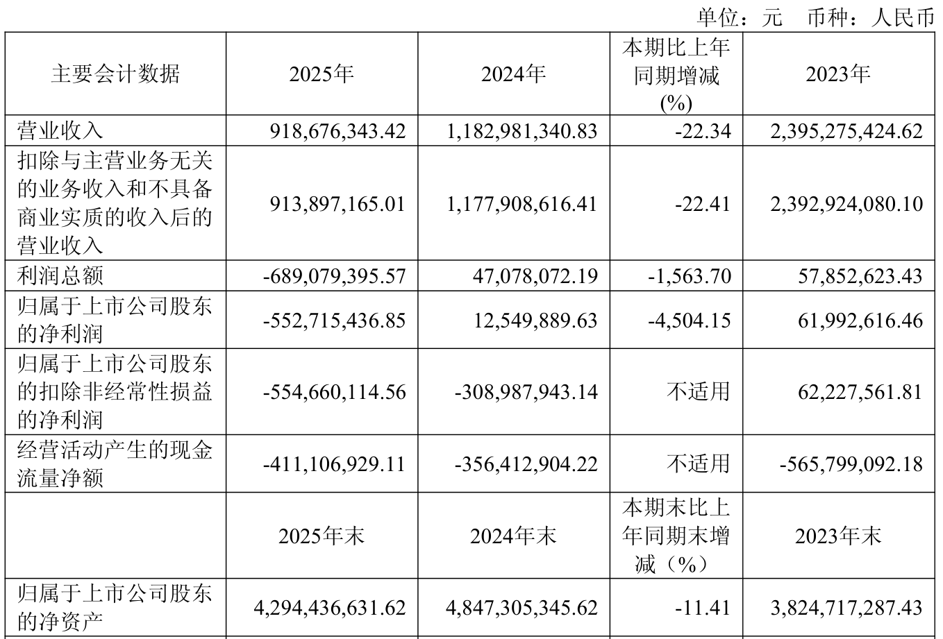 中证智能财讯西藏城投(600773)4月11日披露2025年年度报告。2025年,公司实现营业总收入9.19亿元,同比下降22.34%;归母净利润亏损5.53亿元,上年同期盈利1254.99万元;扣非净利润亏损5.55亿元,上年同期亏损3.09亿元;经营活动产生的现金流量净额为-4.11亿元,上年同期为-3.56亿元;报告期内,西藏城投基本每股收益为-0.58元,加权平均净资产收益率为-12.09%。