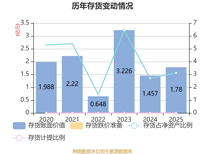 从存货变动来看,截至2025年末,公司存货账面价值为1.78亿元,占净资产的3.12%,较上年末增加3231.83万元。公司本期没有计提存货跌价准备。