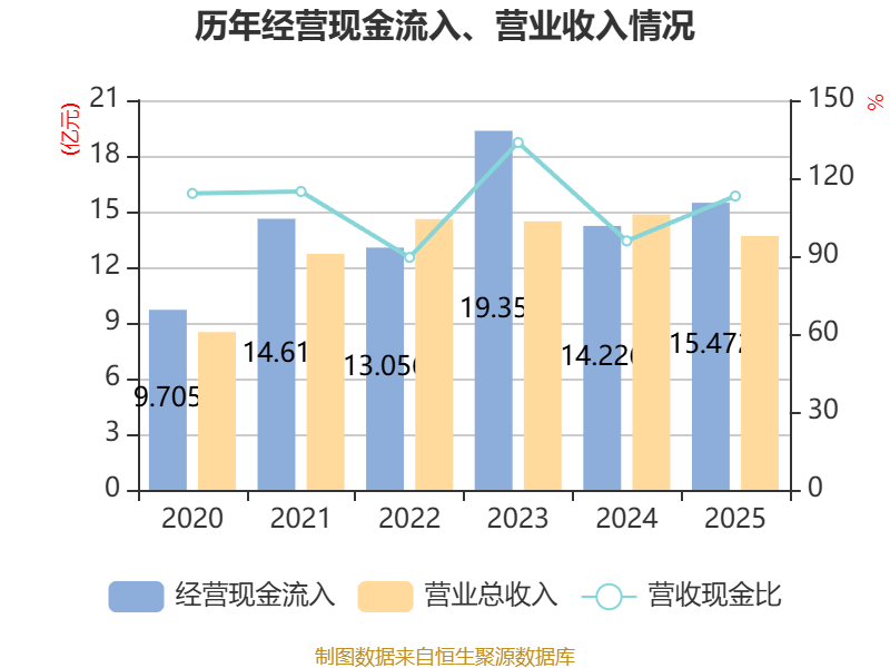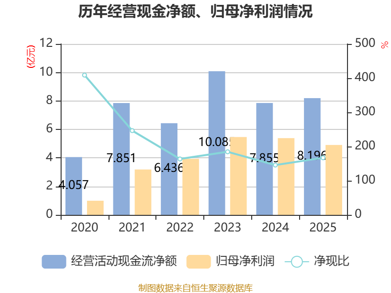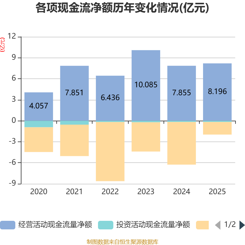 截至2025年,公司经营活动现金流净额为8.2亿元,同比增长4.34%;筹资活动现金流净额-1.79亿元,同比增加4.29亿元;投资活动现金流净额-1810.18万元,上年同期为-1805.2万元。