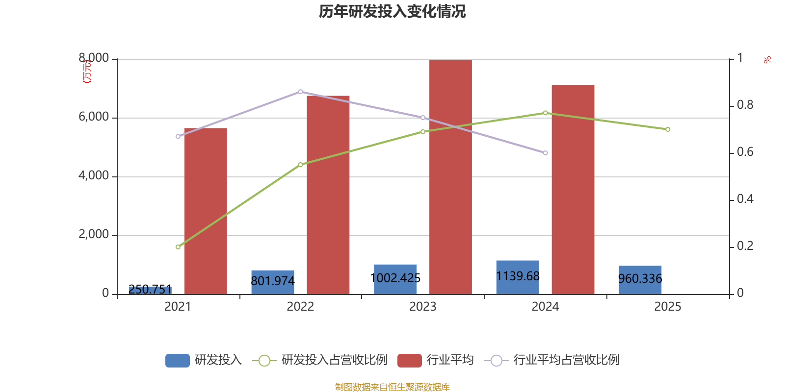 2025年全年,公司研发投入金额为960.34万元,同比下降15.74%;研发投入占营业收入比例为0.7%,相比上年同期下降0.07个百分点。此外,公司全年研发投入资本化率为0%。