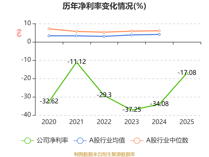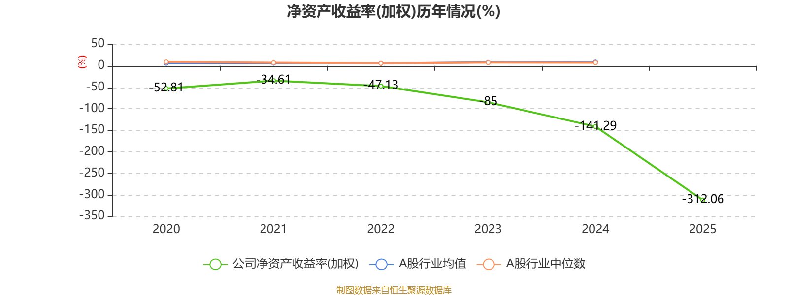 数据显示,2025年公司平均净资产收益率为-312.06%,较上年同期下降170.77个百分点。