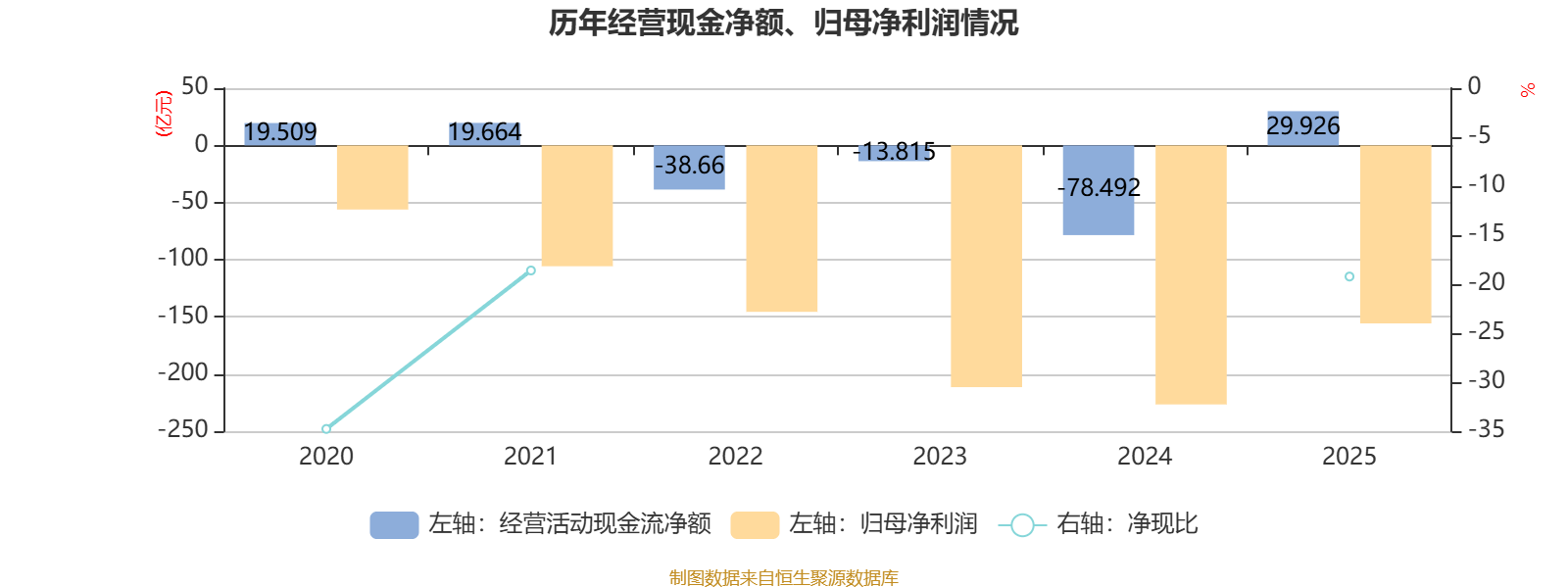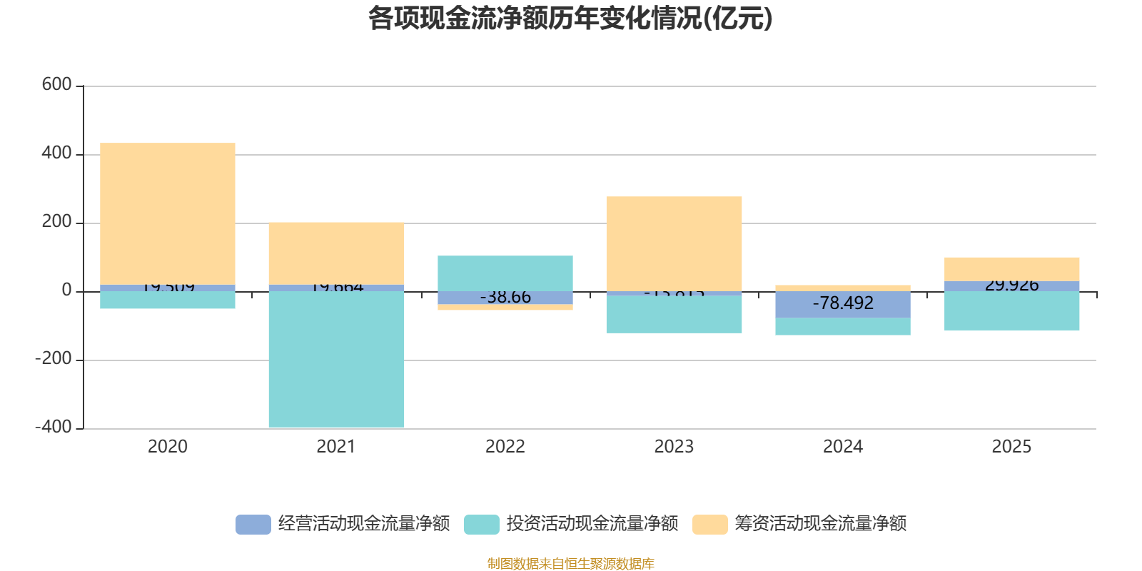 2025年,公司经营活动现金流净额为29.93亿元,同比增加108.42亿元;筹资活动现金流净额68.44亿元,同比增加50.72亿元;投资活动现金流净额-114.6亿元,上年同期为-49.58亿元。