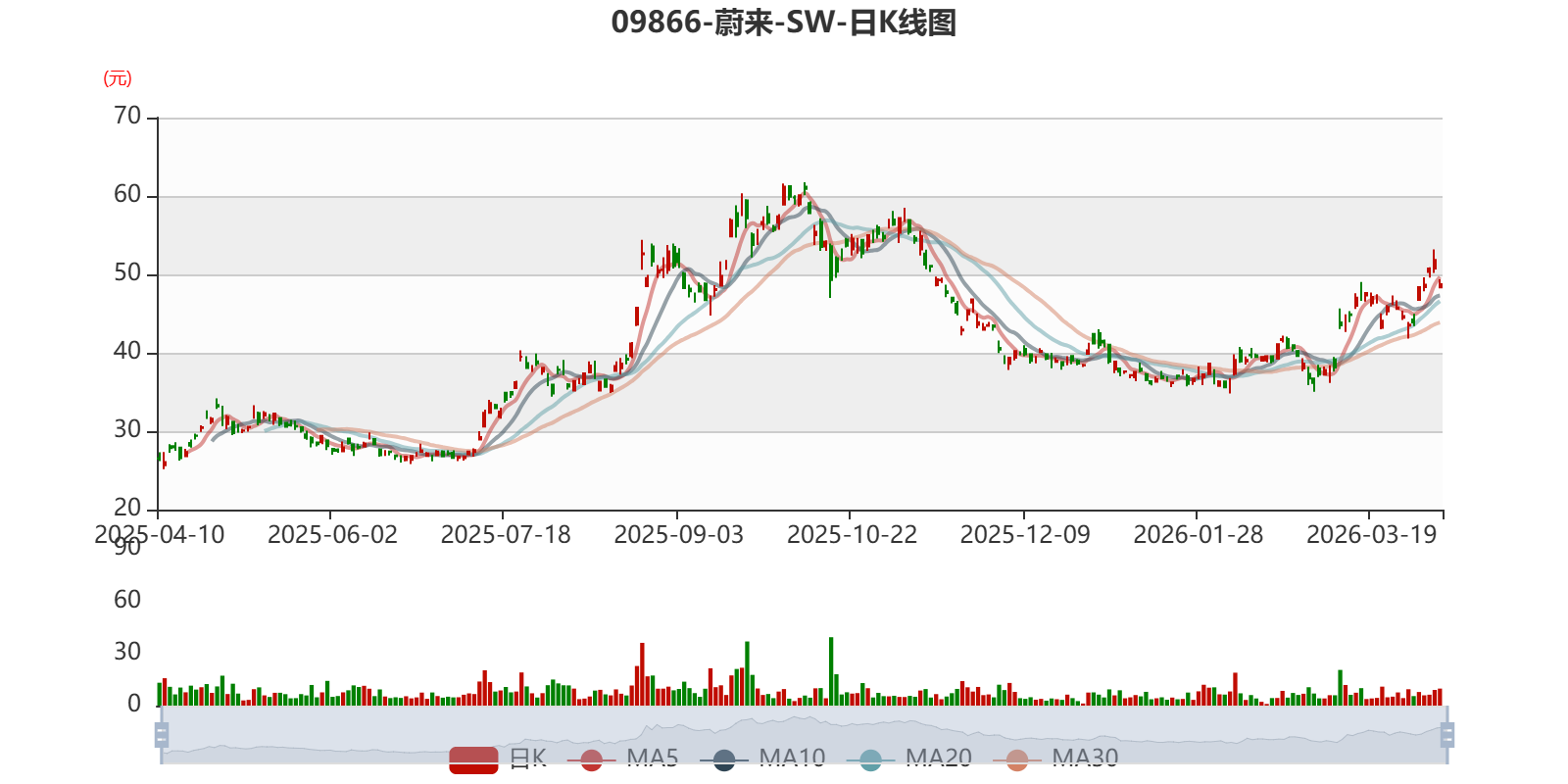 以4月10日收盘价计算,蔚来-SW目前市净率(TTM)约26.09倍,市销率(TTM)约1.24倍。